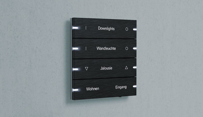Der Tastsensor 4 von Gira ist ein Multitalent: Mit nur einem Schalter steuern Sie bis zu acht Funktionen im Haus. Zum Beispiel Leuchten oder Jalousien. Mit verschiedenfarbigen LEDs leuchtet er im Dunkeln – und kommt individuell beschriftet zu Ihnen. Das ist längst nicht alles:
